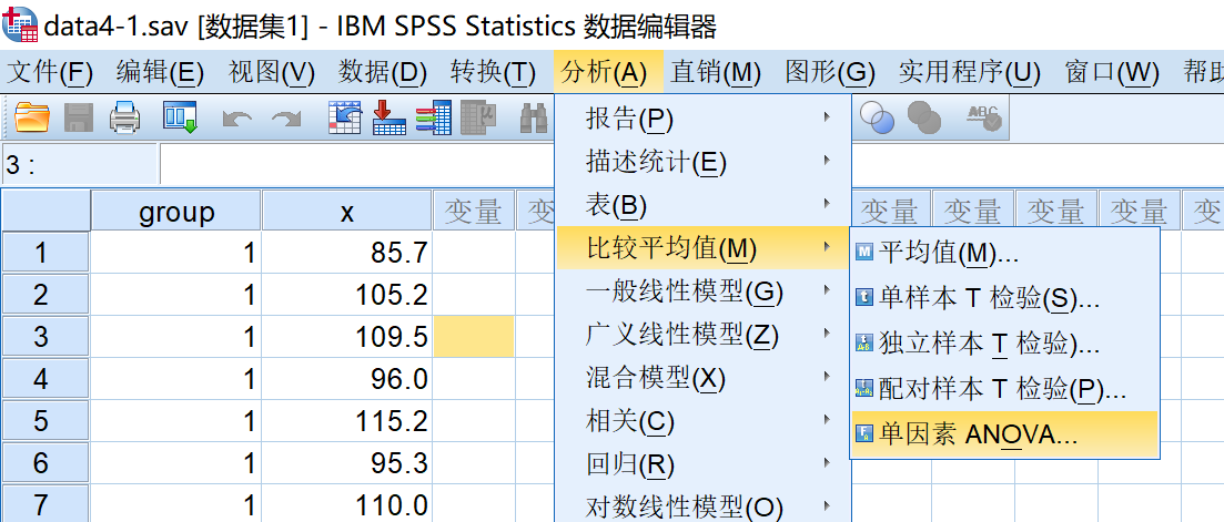 菜单-分析-比较平均值-单因素ANOVA