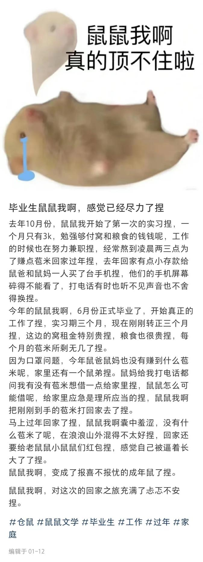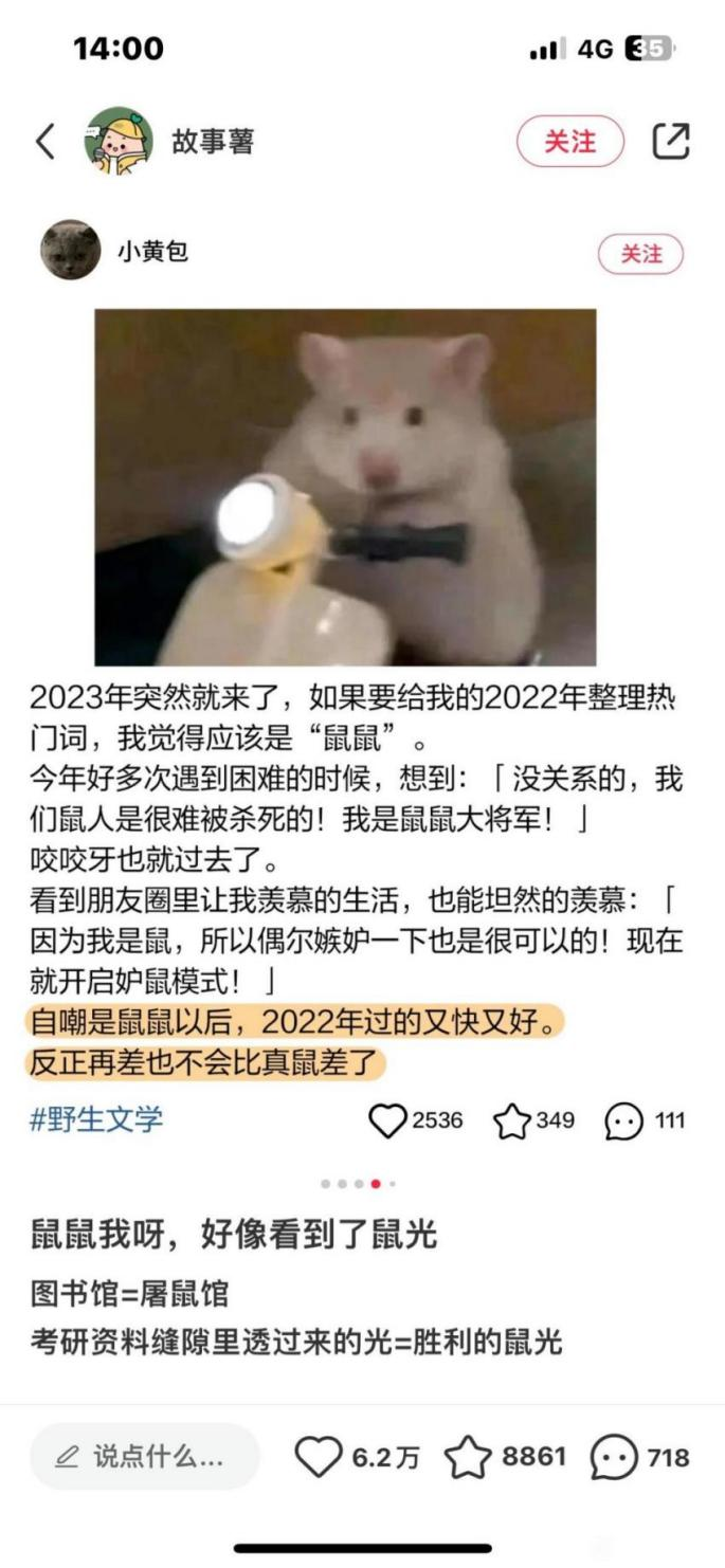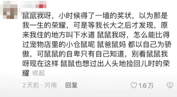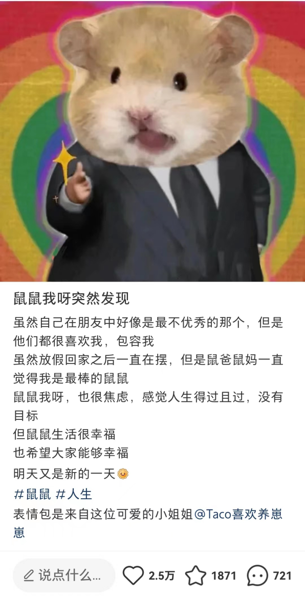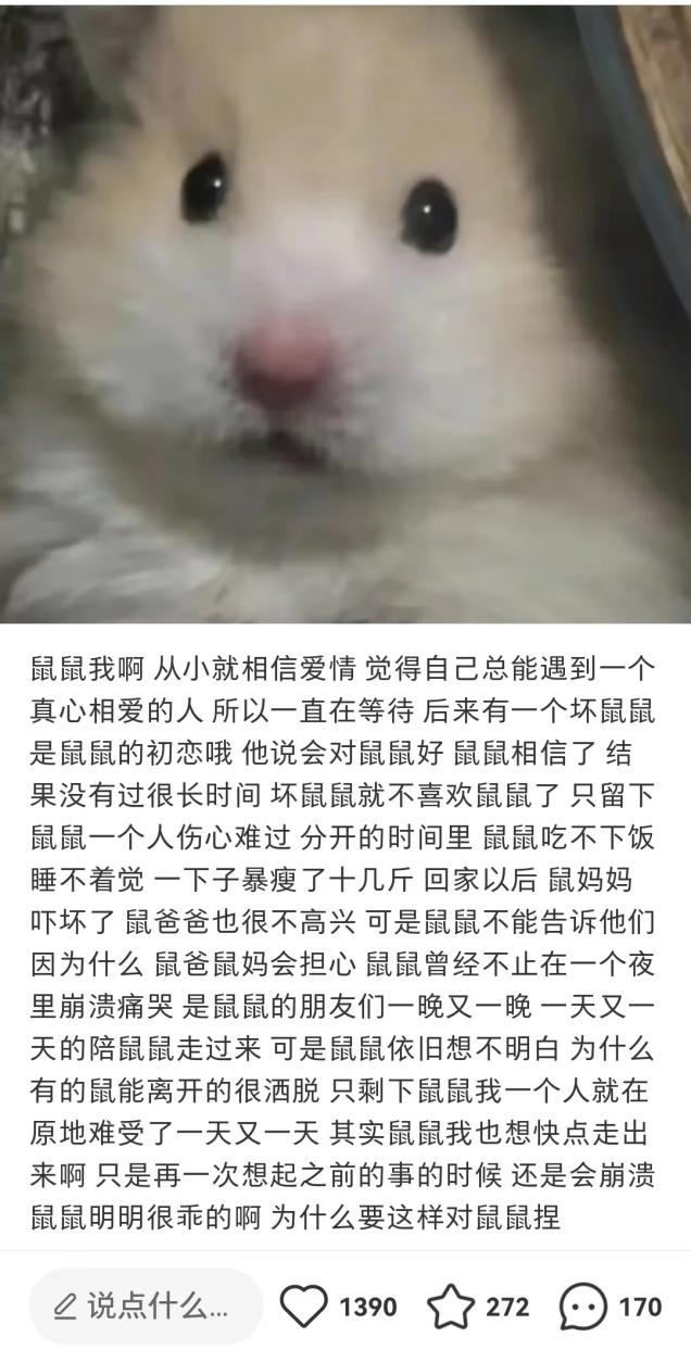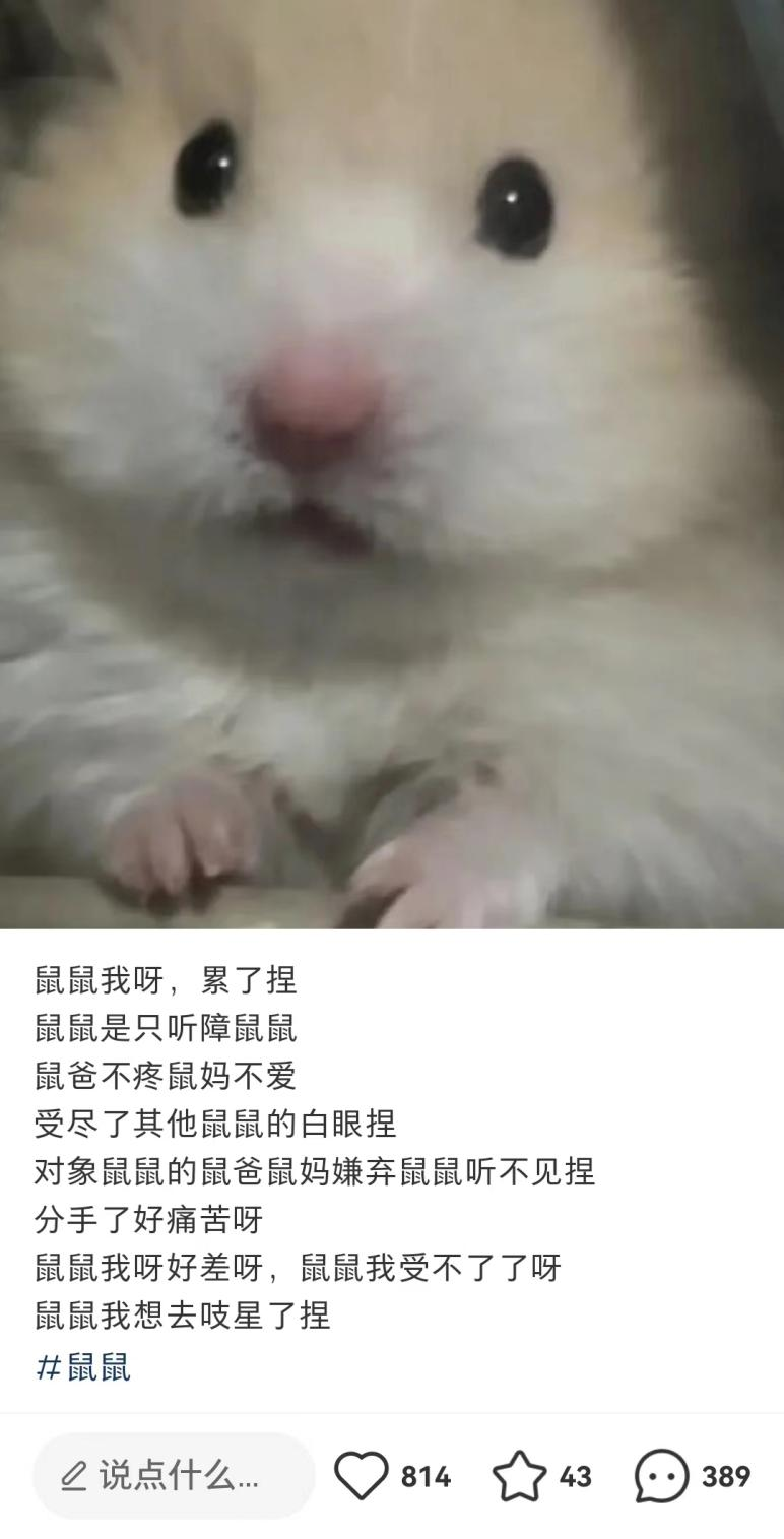 而不知道从什么时候开始,以鼠类为主角的“鼠鼠文学”,则成为了又一个能让大多数人共情的互联网文学。