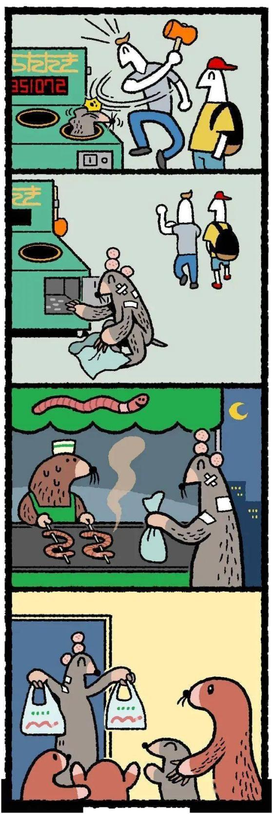 漫画的主角白天充当打地鼠机的地鼠挨打,晚上再拿赚来的钱喂养全家人。虽然在外面受尽了冷眼,但是生活还是要继续,它依旧要以笑脸面对家人,第二天重复挨打的流程。