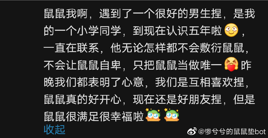 “鼠鼠我啊,虽然还单身,但已经和认识五年的同学互相表明心意了,而且还是互相喜欢的,已经很满足很幸福啦。”