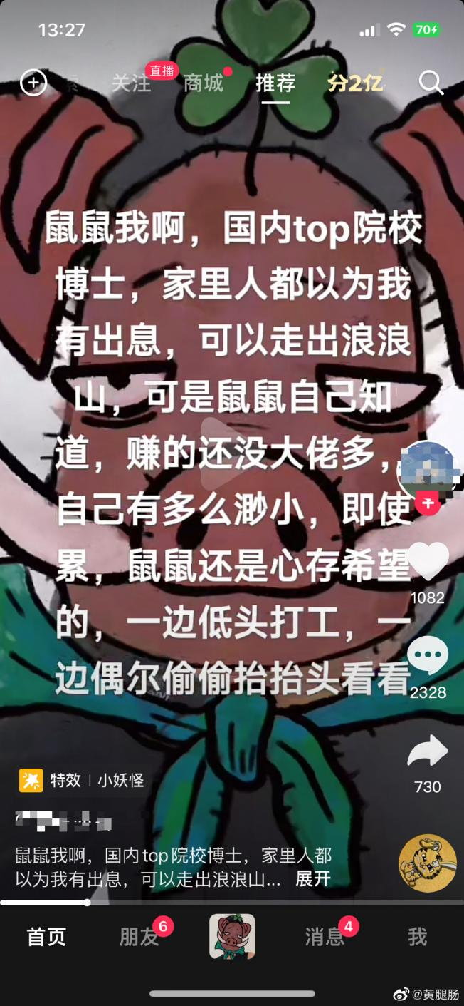 “鼠鼠我啊,虽然是国内top院校博士,家里人都觉得我有出息,但我还是觉得赚的没大佬多,觉得自己很渺小呢。”