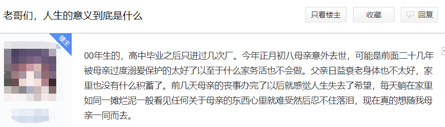 有人也同样叙述了他所经历的:高中毕业就进厂了,今年母亲意外去世,父亲身体也并不太好,家里也没什么积蓄。