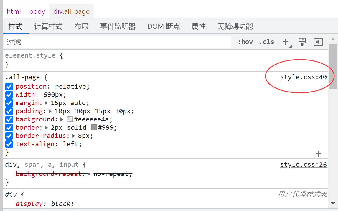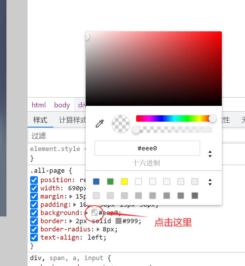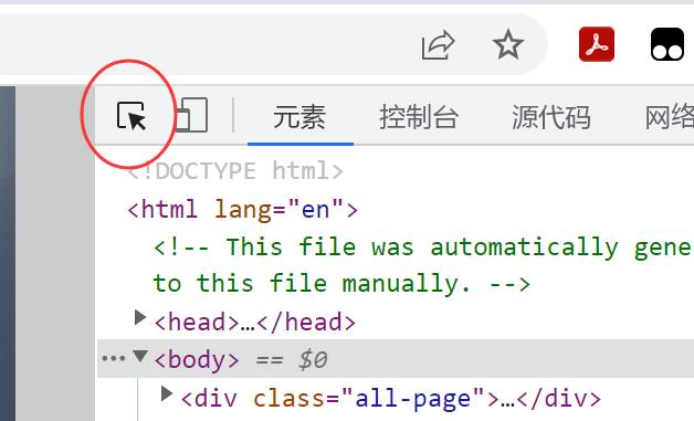 点击按钮,将光标移到想要修改的模块上,然后单击左键,即可在开发者工具的“样式”栏中找到定义块的代码